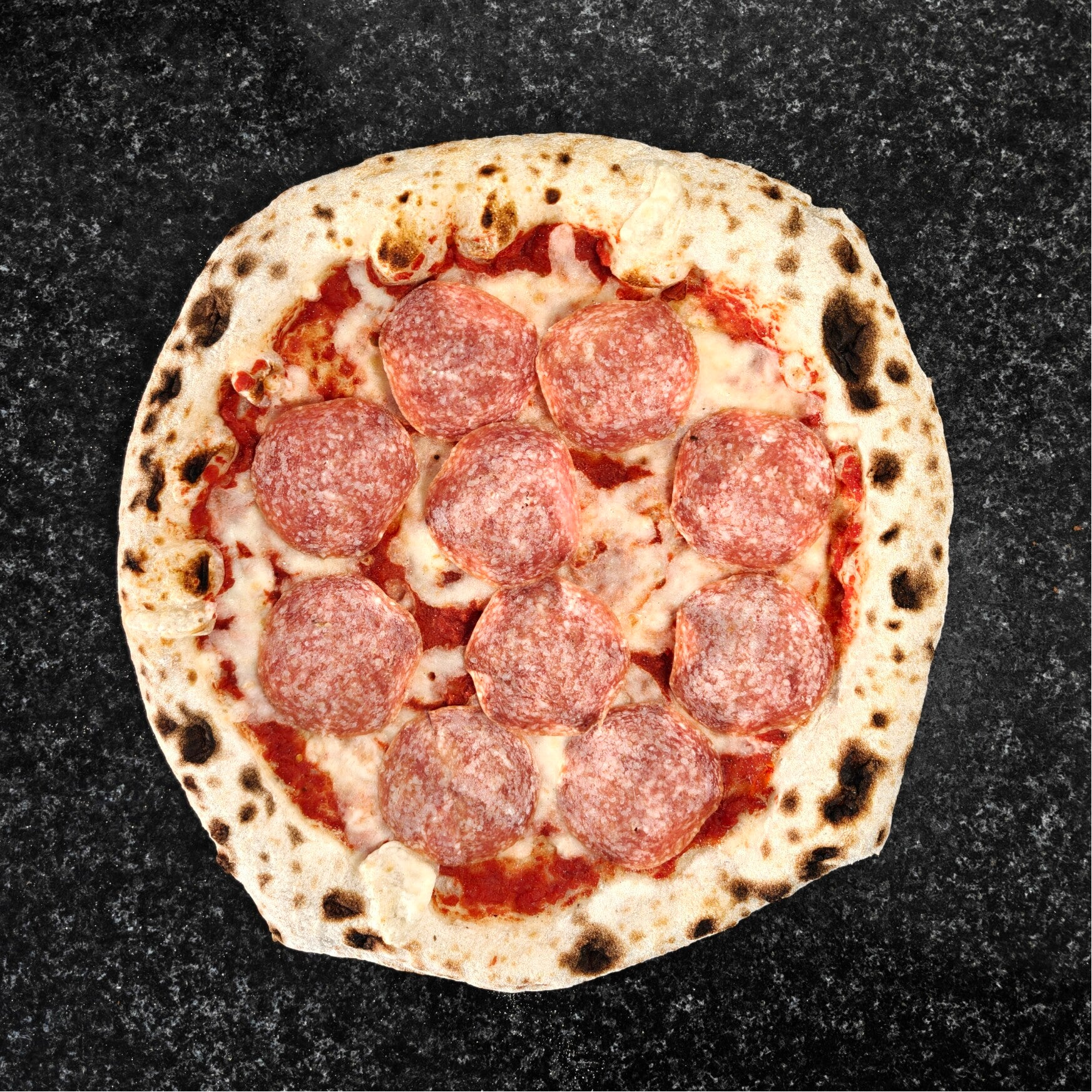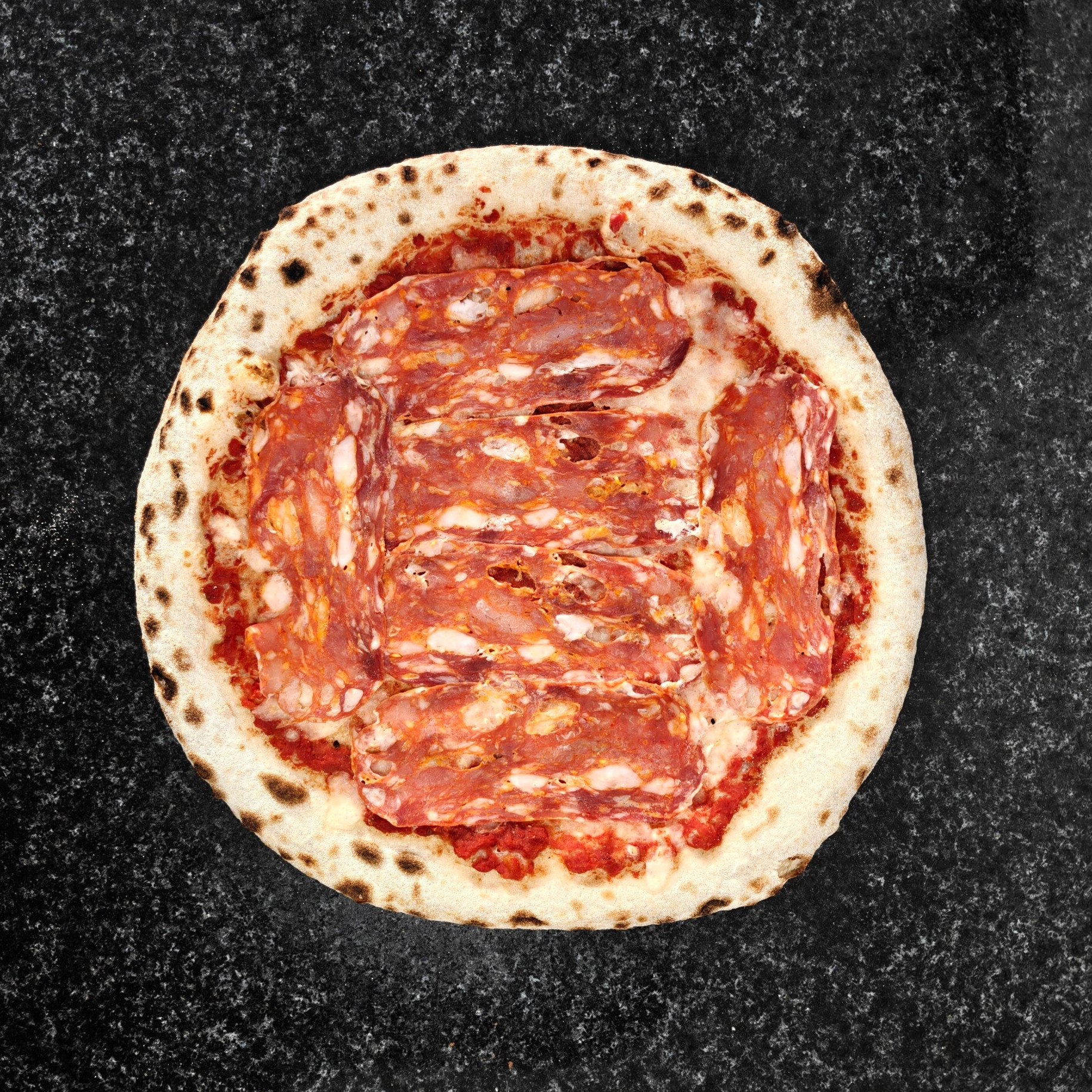 Tomatensauce, Fior di Latte, leicht scharfe Salami
